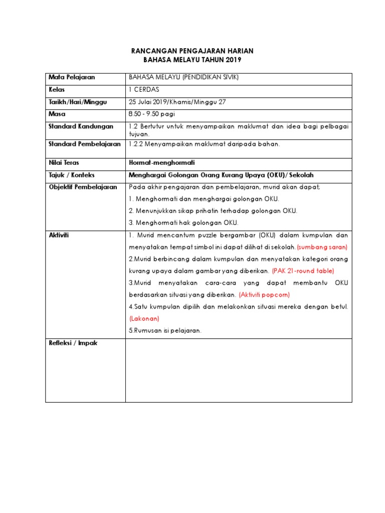Contoh Rph Bahasa Melayu Sivik
